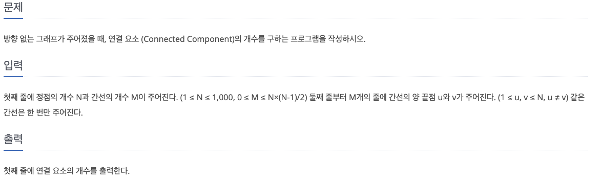 첫째 줄에 정점의 개수 N과 간선의 개수 M이 주어진다. (1 ≤ N ≤ 1,000, 0 ≤ M ≤ N×(N-1)/2) 둘째 줄부터 M개의 줄에 간선의 양 끝점 u와 v가 주어진다. (1 ≤ u, v ≤ N, u ≠ v) 같은 간선은 한 번만 주