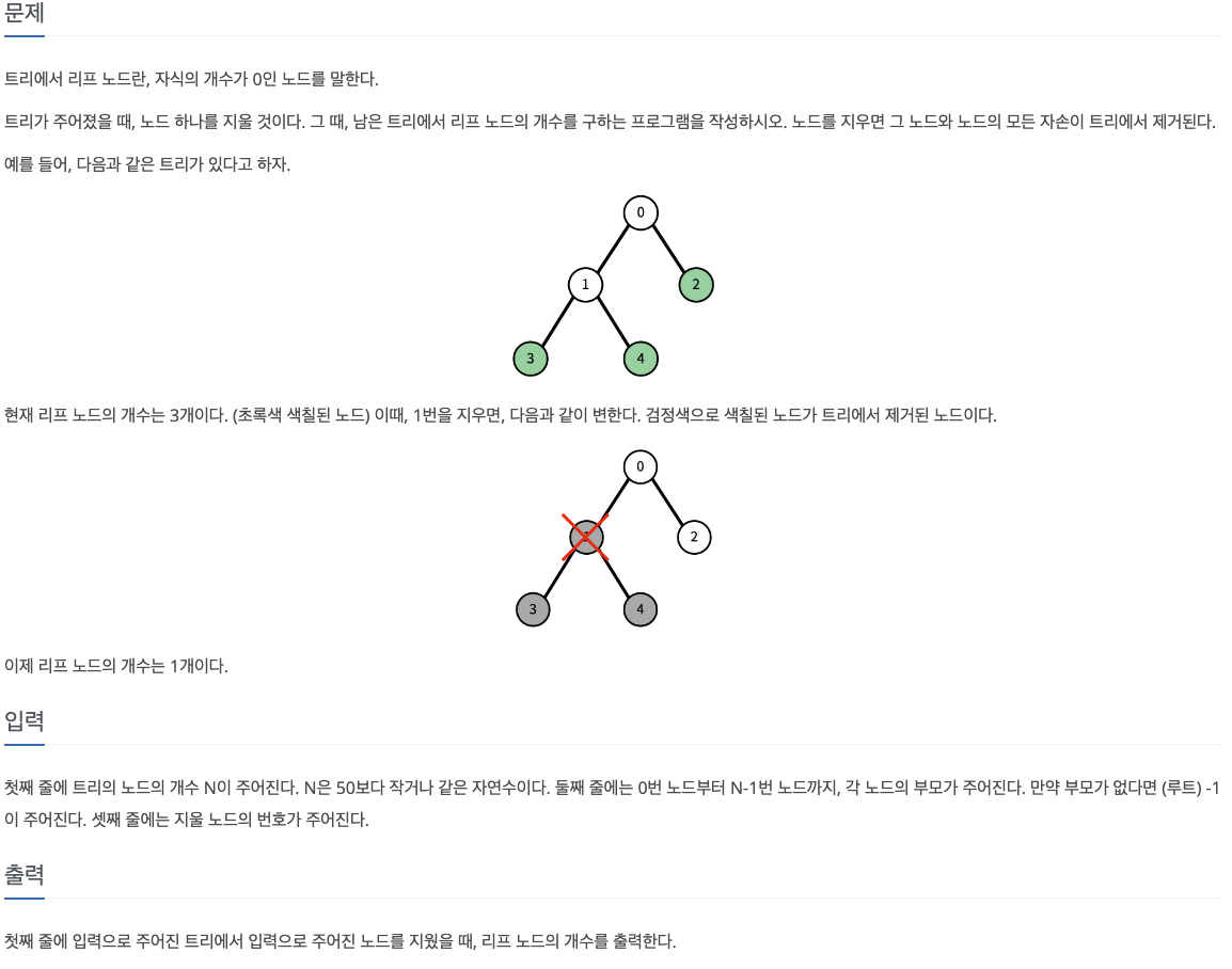 해당 문제는 트리의 Node중 하나가 지워졌을 때 마지막 노드(리프 노드)를 탐색하는 문제이다.