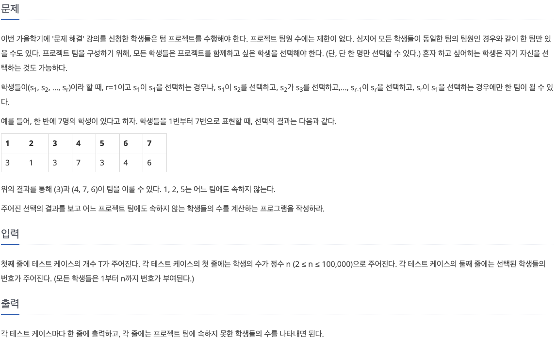 텀 프로젝트 문제는 원형 트리가 생기면 그 노드끼리 팀이 형성되고, 최종적으로 팀에 속하지 못한 노드의 수를 구하는 문제이다.
