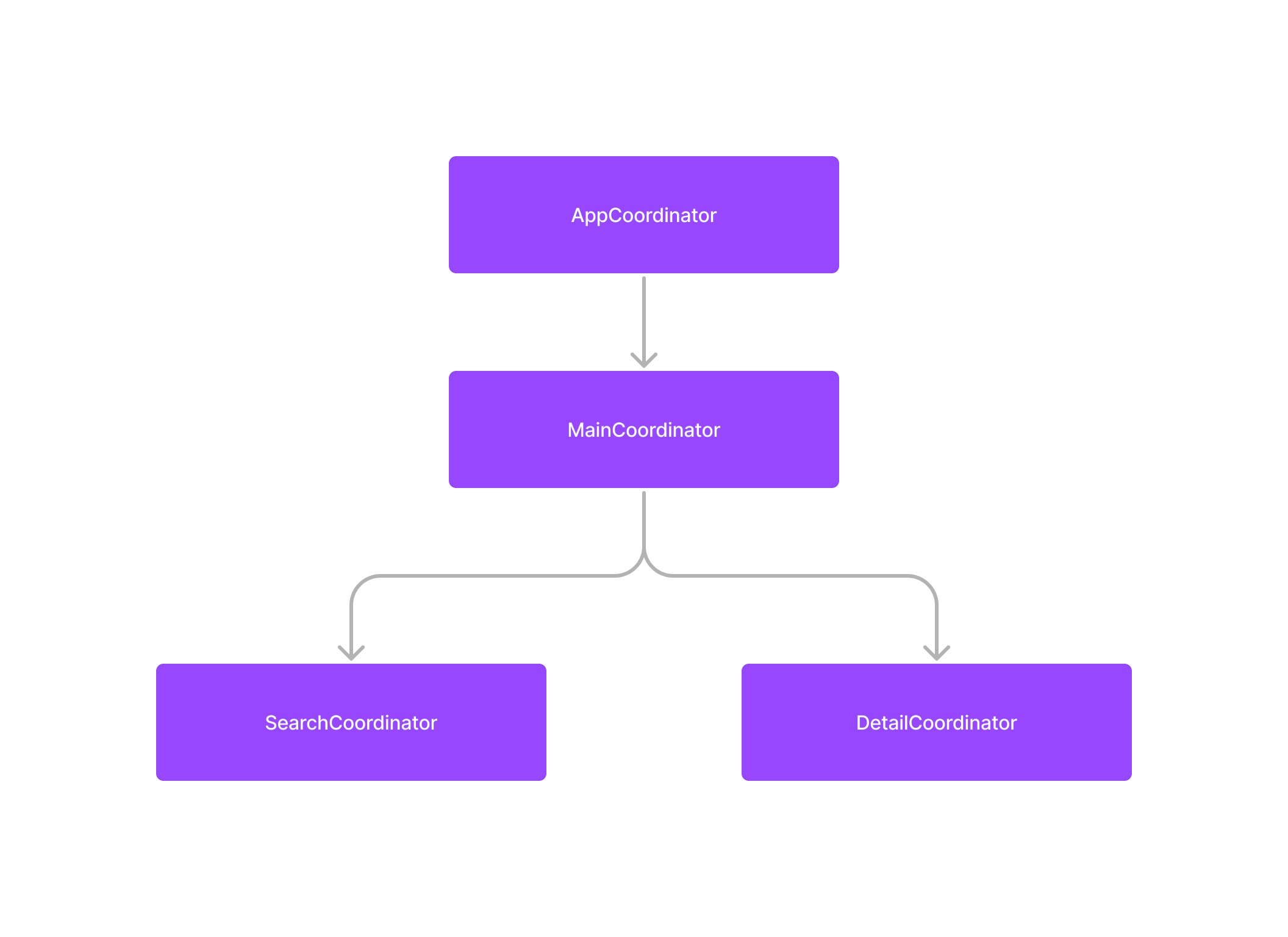 위와 같이 MainCoordinator 내부에는 start 메 서드와 다음 자식 화면으로 이동하는 메서드를 구현해 줍니다. childCoordinator와 parentCoordinator 파라미터를 통해 계층 간 연결고리를 이어줍니다. 이는 화면을 사라질 때 해당 화면의 Coordinator 또한, 같이 deinit 되어야 하기 때문입니다.