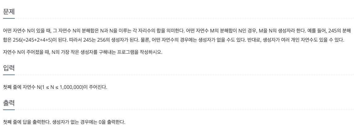 분해합 문제의 경우 특정수 N에 대하여 생성자를 찾는 문제이다.