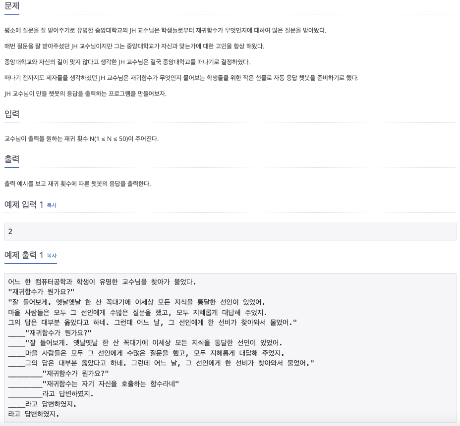 평소에 질문을 잘 받아주기로 유명한 중앙대학교의 JH 교수님은 학생들로부터 재귀함수가 무엇인지에 대하여 많은 질문을 받아왔다. 매번 질문을 잘 받아주셨던 JH 교수님이지만 그는 중앙대