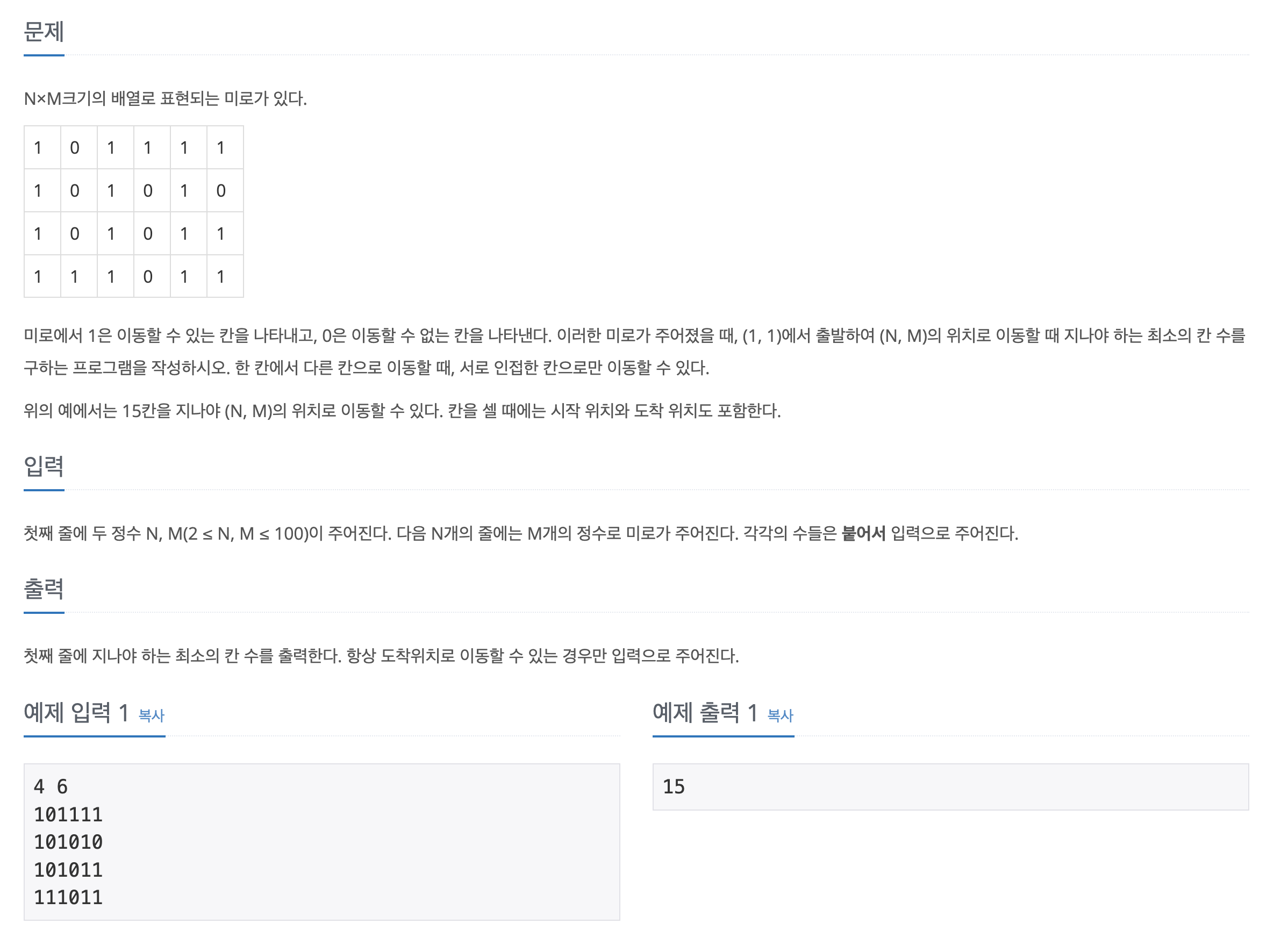 첫째 줄에 두 정수 N, M(2 ≤ N, M ≤ 100)이 주어진다. 다음 N개의 줄에는 M개의 정수로 미로가 주어진다. 각각의 수들은 붙어서 입력으로 주어진다.