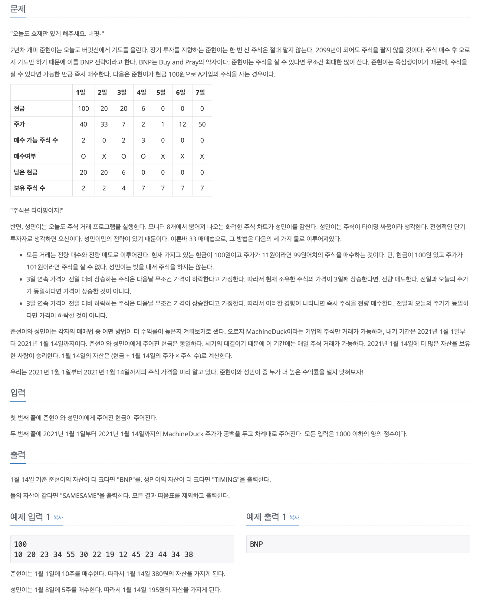 1월 14일 기준 준현이의 자산이 더 크다면 "BNP"를, 성민이의 자산이 더 크다면 "TIMING"을 출력한다. 둘의 자산이 같다면 "SAMESAME"을 출력한다. 모든 결과 따옴표를 제외하고 출력한다.