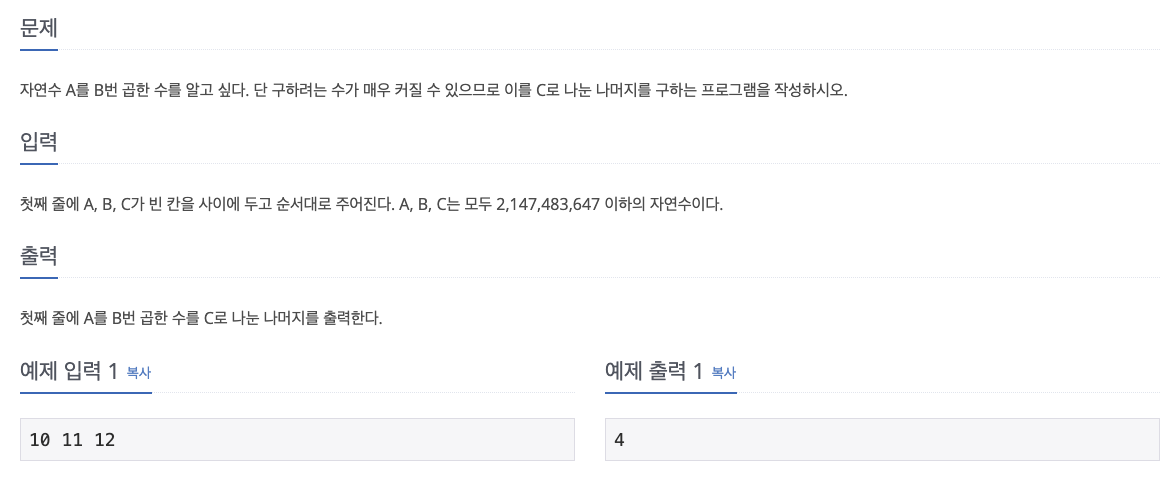 해당 문제는 A의B승을 C로 나눈 나머지를 구하는 문제이다.