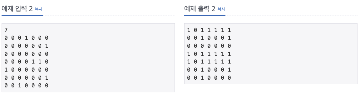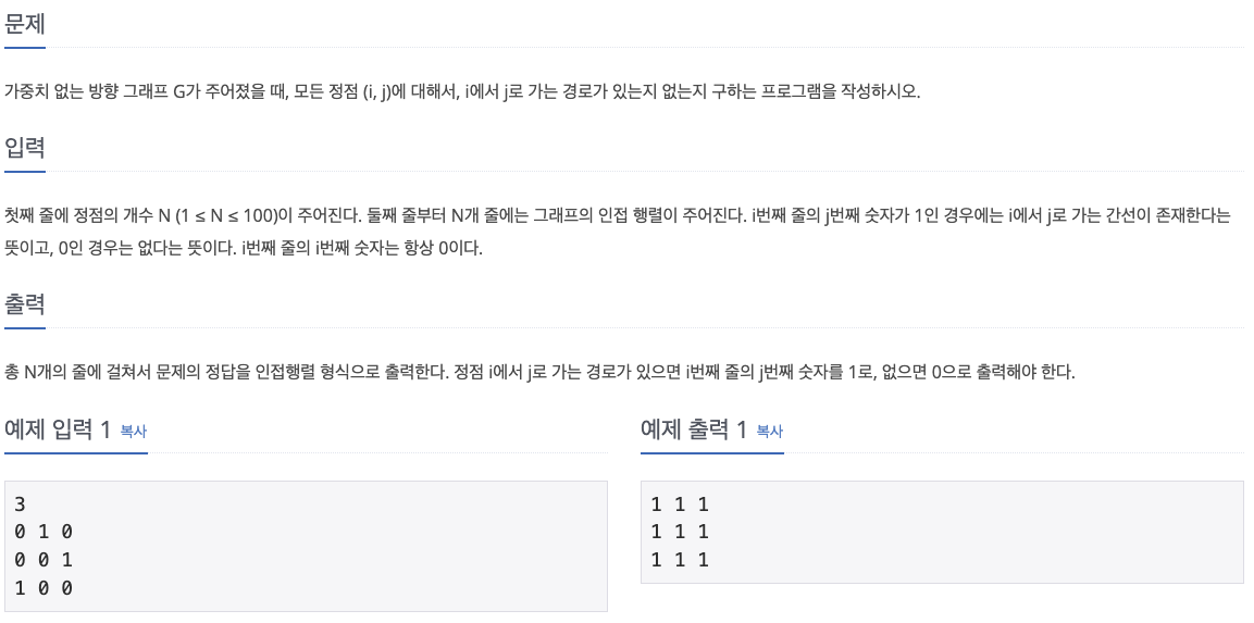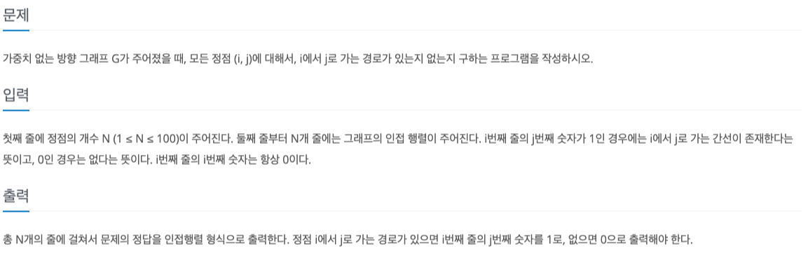 가중치 없는 방향 그래프 G가 주어졌을 때, 모든 정점 (i, j)에 대해서, i에서 j로 가는 경로가 있는지 없는지 구하는 프로그램을 작성하시오.