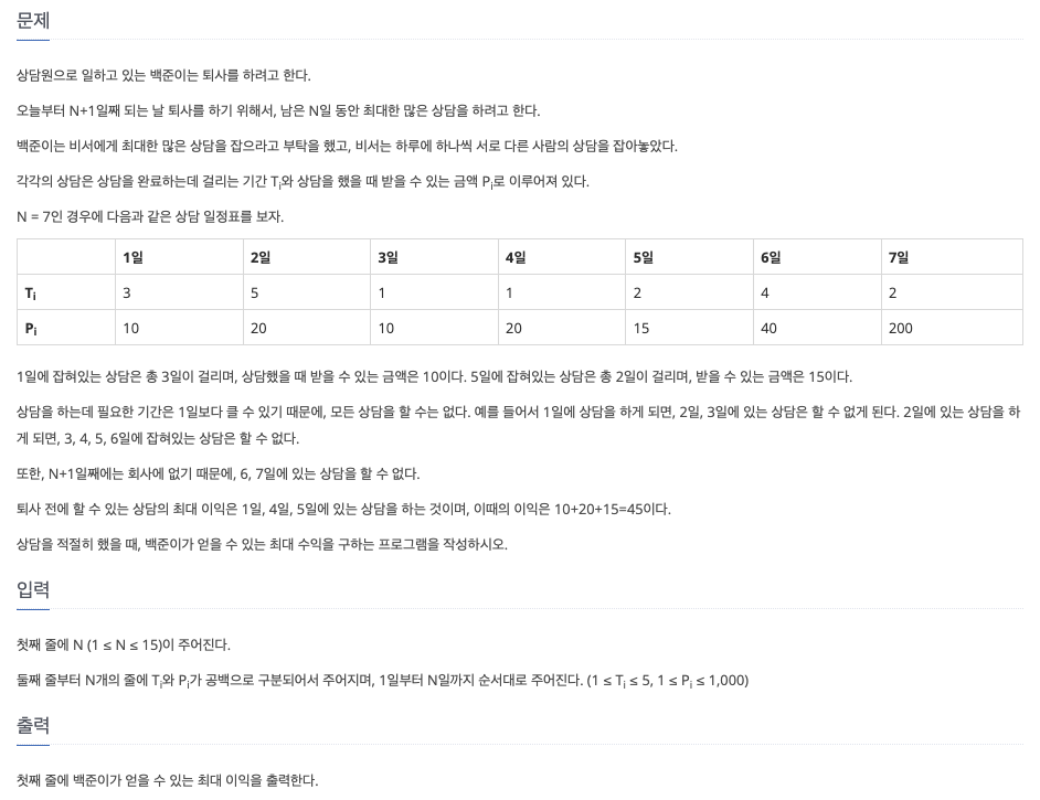 이번 문제는 주어진 백준이 주어진 N + 1일 동안 업무를 했을 때 벌 수 있는 최대 누적 금액을 구하는 문제이다.