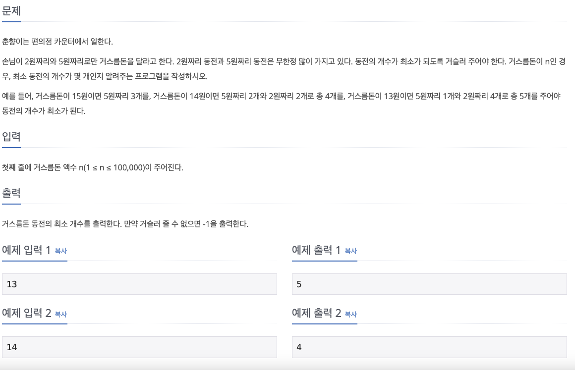 위 문제는 거스름돈 5원과 2원으로 주어진 돈을 거슬러 줘야 하는데 이때 동전을 최소한으로 사용하여 거슬러 줘야 한다.
