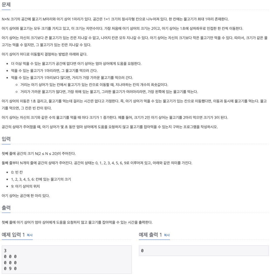 해당 문제는 상어가 먹이를 찾아 먹는 과정에서 이동 거리(시간)을 계산하는 문제이다.