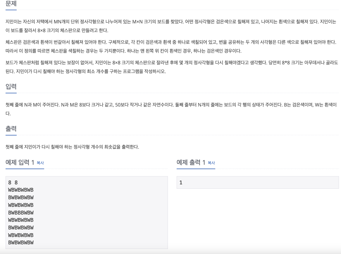 위 문제는 검정색(B)과 흰색(W)이 무작위로 색칠되어 있는 체스판을 8x8로 잘라 올바르게 다시 색을 칠할 때 칠해야 하는 정사각형의 최소 개수를 출력하는 문제이다.