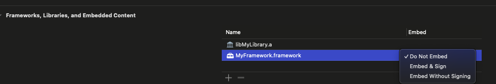 정적 프레임워크의 경우 App 실행 파일에 이미 프레임워크의 소스 코드가 포함되어 있기 때문에 번들에 포함시킬 필요가 없다. 때문에 Embed를 Do Not Embed 설정하는 것을 권장한다. 만약, 프레임워크에 리소스가 포함되어 있는 경우 Embed & Sign로 설정하여 번들에 포함시켜야한다. App 실행 파일에는 소스 코드만 포함되기 때문이다.