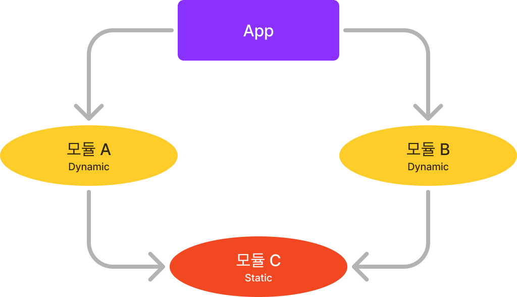 위와 같이 모듈끼리 의존한다고 가정했을 때 모듈 C의 소스 코드가 모듈 A와 모듈 B에게 복사되기 때문에 최종적으로 App에서 모듈 C의 소스 코드가 중복되는 문제가 발생할 수 있다. 이를 해결하기 위해선 모듈 C를 동적 라이브러리로 변경해줘야 한다.