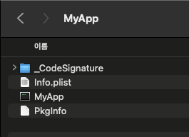 위와 같이 MyApp이라는 Bundle이 생성되고, 내부에는 MyApp의 실행 파일과 plist와 같은 앱 실행에 필요한 리소스 파일들이 존재한다.