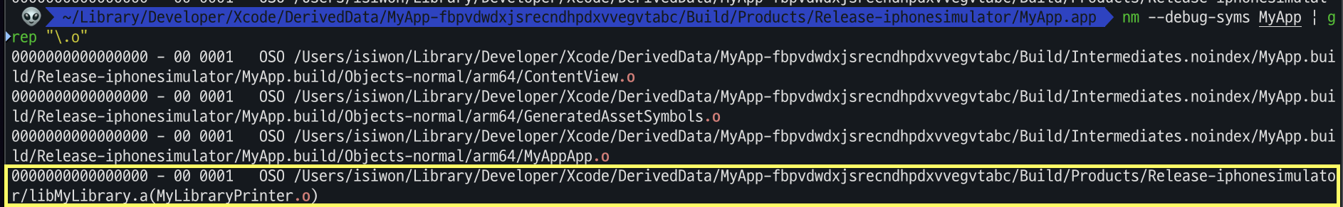 내부에 MyLibrary의 오브젝트 파일이 포함되어 있는 것을 확인할 수 있다.