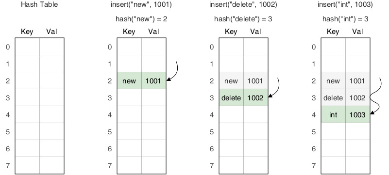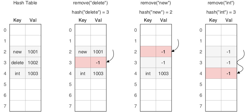예를들어, 만약 'delete'라는 Key 값을 가진 Value를 제거하면, 'int'라는 값을 찾을 때 3 Index가 비어있기 때문에 정상적으로 탐색할 수 없다.