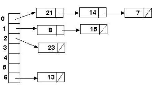 위 이미지 처럼 21, 14, 7이 동일한 Index를 가진다면, 한 Index에 연결 리스트를 활용해 줄줄이 데이터를 저장한다.