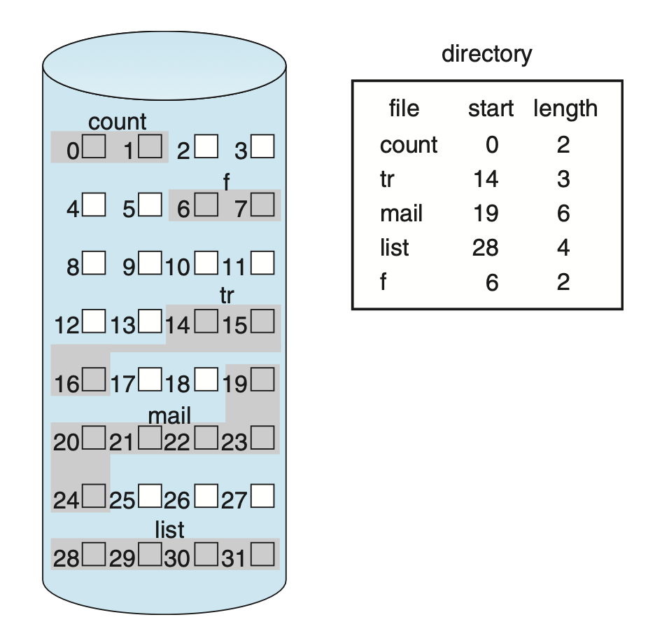 - 연속적이기 때문에 파일에 접근할 때 파일의 첫 번째 블록 주소와 길이(크기)만 알면된다.