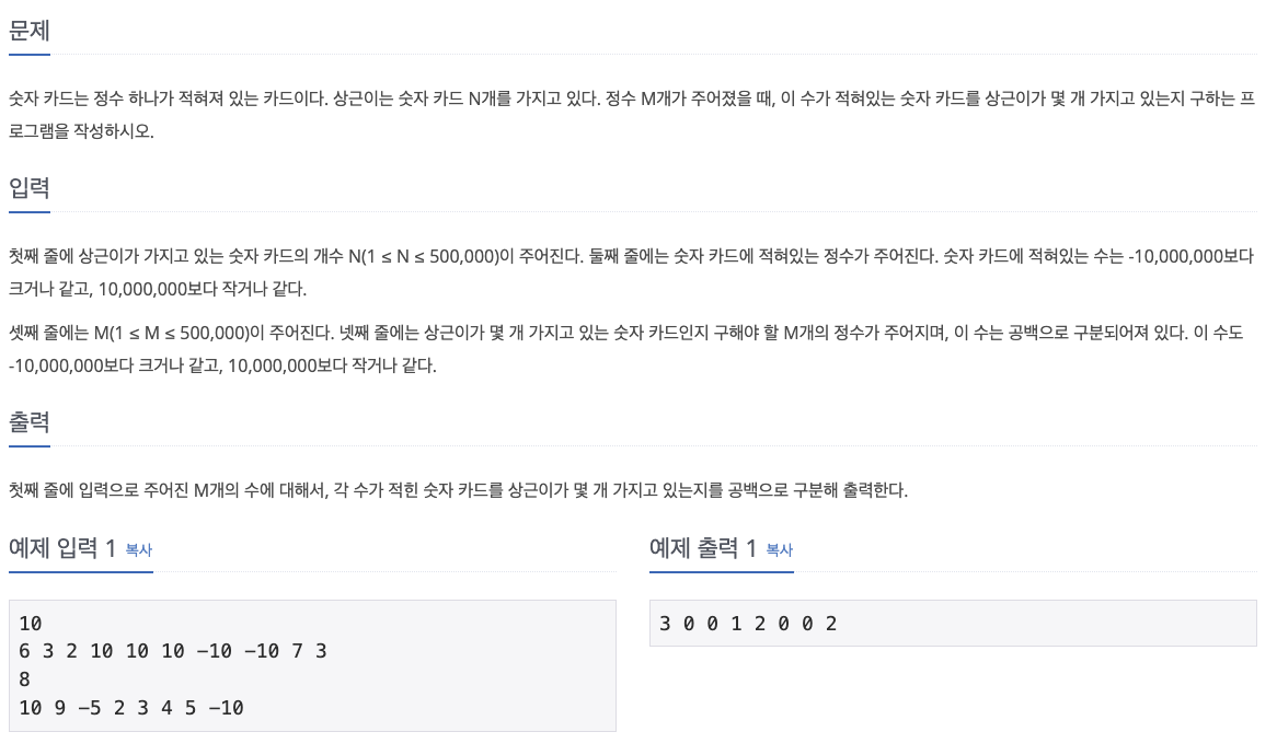 첫째 줄에 상근이가 가지고 있는 숫자 카드의 개수 N(1 ≤ N ≤ 500,000)이 주어진다. 둘째 줄에는 숫자 카드에 적혀있는 정수가 주어진다. 숫자 카드에 적혀있는 수는 -10,000,000보다 크거나 같고, 10,